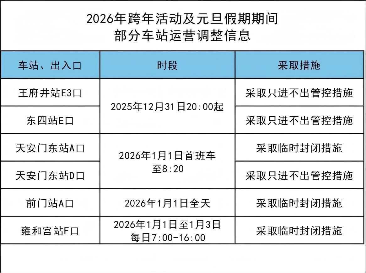除夕、元旦期间,北京部分地铁车站出入口将分
